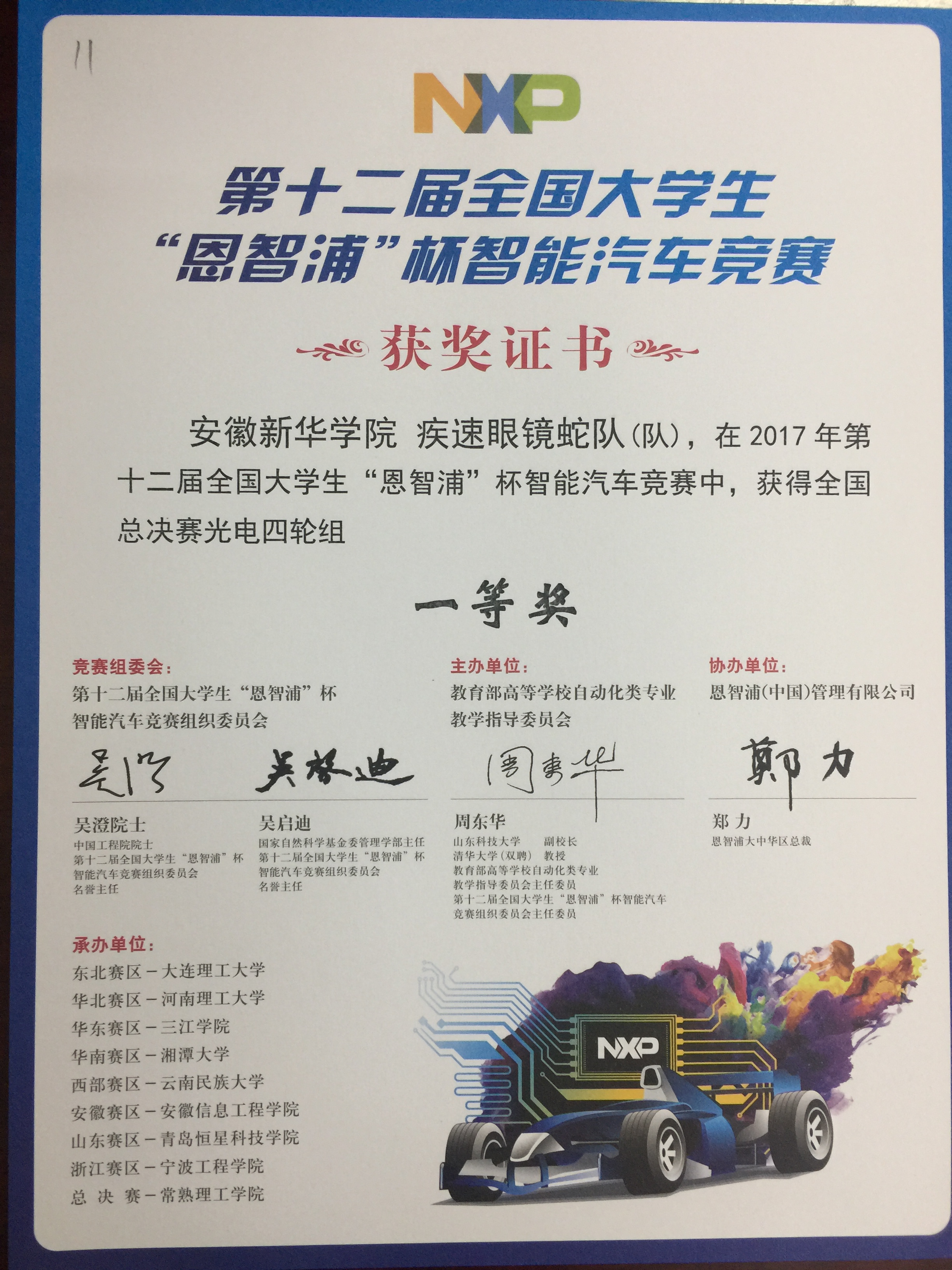 本次第十二届智能汽车竞赛在继承原有赛制的基础上,新增设了四旋翼组、双车对抗组等多个组别,丰富了竞赛形式,而竞赛规模的限制也使得竞争激烈程度更胜往年,全国各地有近500所高校的约2500支队伍报名参赛。在安徽省级赛中,通过与来自全省48所高校的319支队伍同台竞技,“疾速眼镜蛇”队(指导教师:陈业慧 于玉亭)和“音速战神”队(指导教师:徐慧芳 涂德凤)分别荣获安徽省赛区光电四轮竞速组一等奖和光电追逐组二等奖,其中“疾速眼镜蛇”队以安徽赛区光电四轮竞速组第三名的好成绩晋级全国总决赛,“征服者”队四旋翼创意组(指导教师:李长凯 苏宁馨)直接晋级全国总决赛。