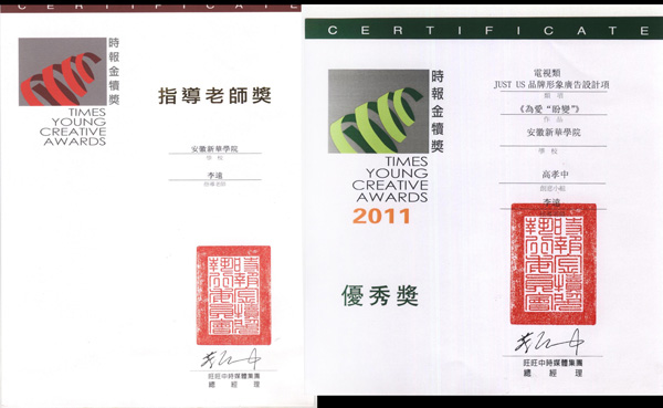 时报金犊奖由中国台湾四大报纸之一的《中国时报》创办于1992年,是全球华人地区规模最大的学生广告活动,每年都有来自世界各地的学生参加,本届金犊奖共设十大类奖项:平面广告类(分六项评选)、电视广告类、网络广告类、广播广告类、技术类、行销企划类、动画广告类、插画类、装置艺术类、人物品造型类;另设最佳文案、最佳美术、最佳原创、全场大奖等四个大奖。本届赛事,两岸参赛作品达到22355件。其中,大陆地区参赛作品13830件,参赛学校917所,均创下历年最高纪录。由贝博官网动漫学院教师李远指导,学生高孝中创作的电视类广告作品《爲愛“盼變”》在众多参赛作品获得优秀奖。