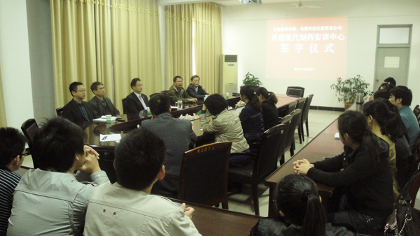 10月28日上午,BB贝博艾弗森官方网站药学院与安徽科创天然药业公司共建“现代制药实训中心”签字仪式在BB贝博艾弗森官方网站第二会议室隆重举行。BB贝博艾弗森官方网站教学副院长马凤余教授、安徽科创天然药业公司董事长余世春教授、药学院院长张国升教授出席了签字仪式,药学院教师、学生代表共二十余人共同参加了签字仪式。