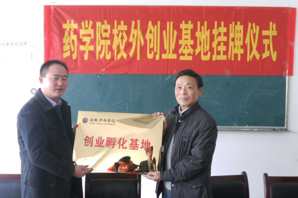 药学院院长张国升教授和肥西县医药公司卢越总经理代表双方共同为校外创业孵化基地进行了揭牌仪式。
