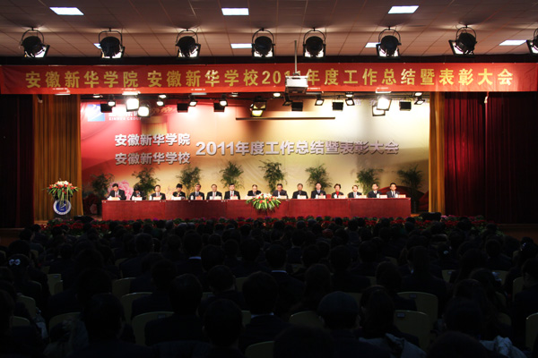 安徽新华集团副总裁王孝武宣读了《关于表彰2011年度先进集体和先进个人的决定》,授予5个二级单位“先进集体”、70名同志“先进个人”、22名同志“新教职工进步奖”荣誉称号。主席台前排就坐的领导为获奖单位和个人颁发了奖牌和荣誉证书。