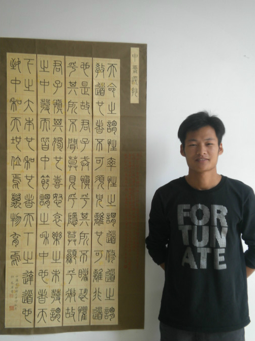 继贝博官网方胜亮同学在全国第二届大学生艺术展演活动中获得了全国二等奖的佳绩后,杜春军在全国第三届大学生艺术展演活动中再创辉煌。从2011年10月份接到比赛通知,杜春军做了精心的准备,在选材、选纸笔、起稿一直到完成四尺的《中庸选抄》作品,一共用了半个月的时间。此次创作灵感源自于第三届大学生艺术展演活动的主题“青春•使命 ”,他认为《中庸》中的一些思想是当今大学生应该学习的。“感谢生命中过去现在亦或是将来的辛酸苦困,更感谢在此间给我教诲、帮助的人和事。”参赛过程中,书画协会指导老师江健龙、王维华给了杜春军很大的帮助,当谈及大学三年多来老师对于自己书法以及为人处世的教诲,杜春军十分感谢两位指导老师。
