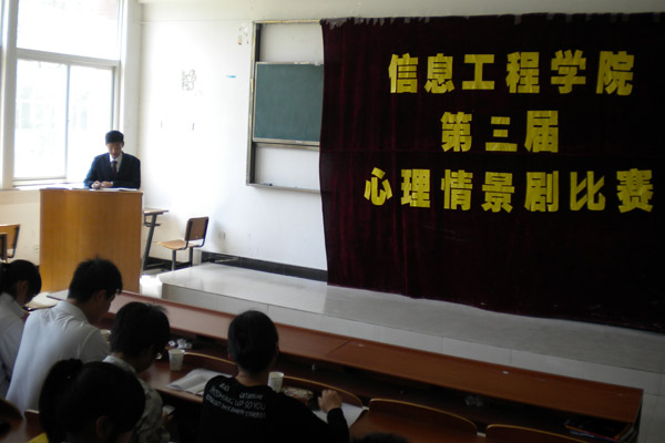 4月23日---5月2日,信息工程学院开展心理情景剧的初赛与复赛,经过宣传,本次比赛活动共有20余支参赛队伍,剧本内容覆盖面较广,有表现大学生迷茫生活、校园恋爱、宿舍矛盾等主题,将同学们在生活中遇到的情感问题表现地形象、生动,再现大学生的思想感情、心理状态以及内心的矛盾与困惑。经过两轮比赛,最终2011级网络工程专业表演的<<当雾迷住双眼>>在比赛中脱颖而出,代表信息工程学院参加BB贝博艾弗森官方网站心理情景剧比赛,获得第三名的好成绩。