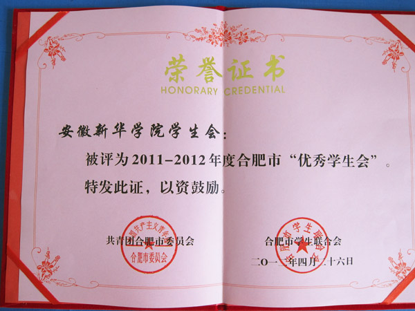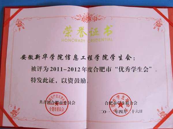 近期,在2011-2012年度合肥市“优秀学生会”评选中,校学生会、信息工程学院学生会被评为本届合肥市“优秀学生会”。