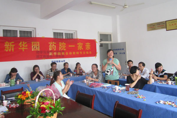 9月10日下午,药学院全体老师集聚一堂组织开展了别开生面的座谈会,庆祝自己的节日。座谈会上,首先,药学院副院长王飞转达了新华集团及BB贝博艾弗森官方网站致全体教职工教师节的慰问信。药学院学生给老师送来鲜花表达对老师的祝福,院长张国升教授还为在场的每一位老师送上一杯热茶祝全体老师节日快乐。