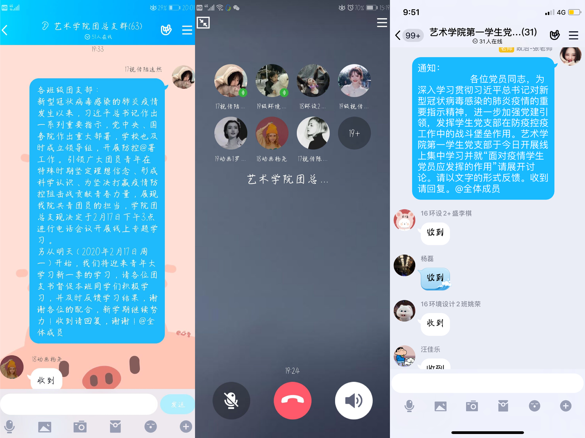 艺术学院各党支部、团支部开展线上学习工作,以党建带团建,通过QQ群、微信群,借助学习强国等平台,组织党员、入党积极分子每日打卡,带头养成良好的个人生活习惯和公共卫生习惯,科学作息,不误学习,注重健康,适当运动,出门佩戴口罩,积极做好安全防护,带头不串门、不扎堆、减少不必要的外出活动,在疫情防控工作中走在前、做表率,以实际行动影响和带动身边同学。