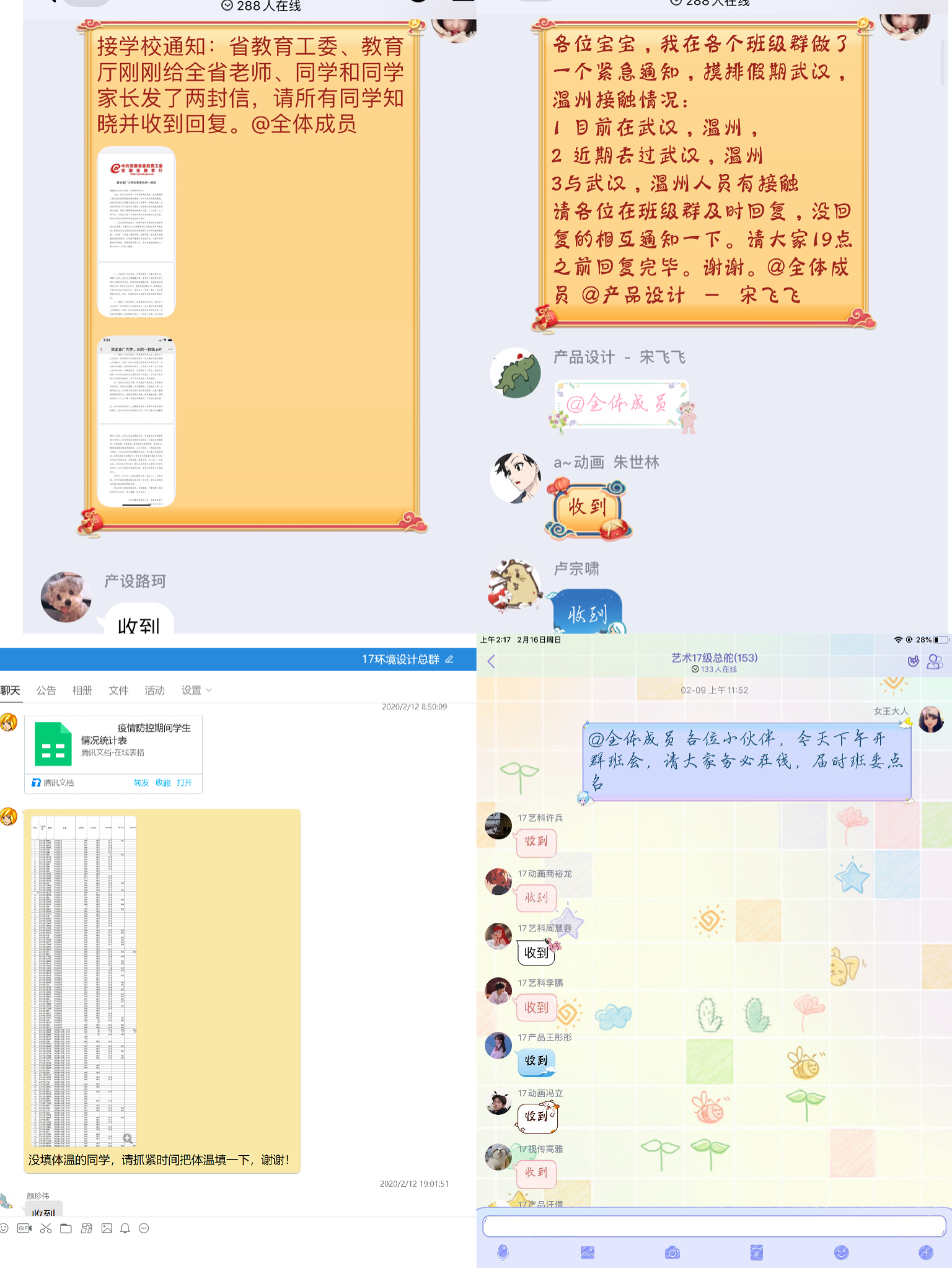 艺术学院召开全体学工团队视频会议,学工队伍全员在线办公,24小时待命。疫情期间,每日关注官宣数据、360度全方位联系学生、了解学生身体状况、发送温馨提示、上报每日数据。毕业班辅导员认真摸排学生实习情况,做好统计。辅导员们创新班会形式,开展云班会,第一时间传达并落实各项工作。