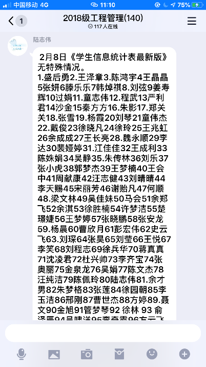 防疫前期,各辅导员利用专业班级QQ群、家长微信群和电话等方式进行排查,准确摸排每一位学生的身体状况、出行情况以及思想动态,是否与武汉等疫区人员有过接触,接触时间地点,是否有发烧,咳嗽,呼吸困难等症状,包括家人状况,并安排各班班长每天汇报班级学生情况,做到双管齐下。同时,及时通报学校的通知和部署、开展疫情防控宣传、统计各项基础数据。