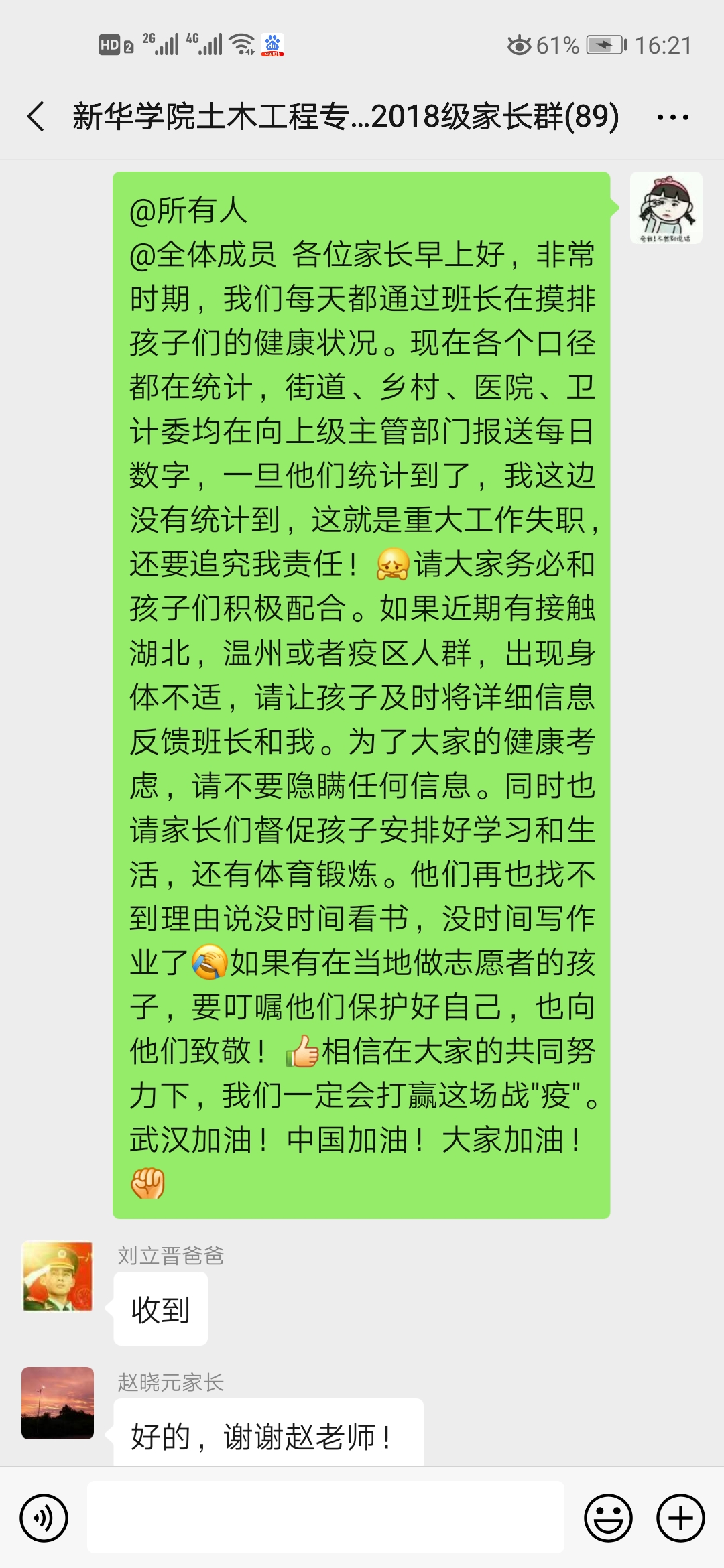 下一步,辅导员们将继续加强学管工作的力度,服从学校的安排,通过在线办公,在学校和学生之间建立有效联系。关注班级QQ群,不放松每日排查,对于疏忽回复的同学,逐一提醒。做好学生心理疏导工作,保持健康状态等待疫情结束。创新采用“群接龙汇报”、“班干/党员同学包干对接”、“先进榜样引导”、“每日健身套餐”、“抗疫阅读书香寒假”等特色活动,丰富假期生活,倡导志愿公益活动,加强身体锻炼,提升学风等。保持高度的政治敏感性,积极贯彻落实党和国家的指示和精神,遏制和打击投机分子,坚决抵制谣言。