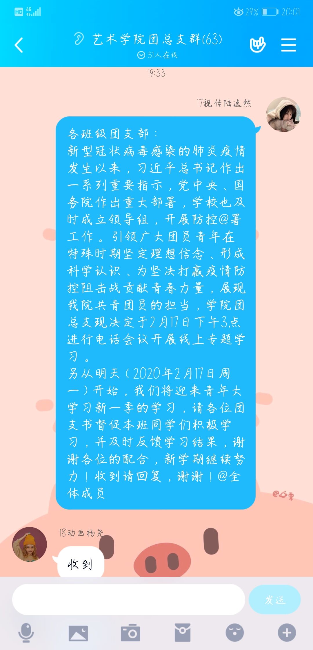 本网讯(通讯员:黄梦)为深入贯彻自新型冠状病毒感染的肺炎疫情发生以来国家及相关部门的重要指示,2月17日下午,艺术学院举办“打好防疫战,贡献我力量”线上专题学习活动。艺术学院团总支书记黄梦、副书记陆逸然(学生)及各团支部书记参加本次线上专题学习。会议由陆逸然主持。