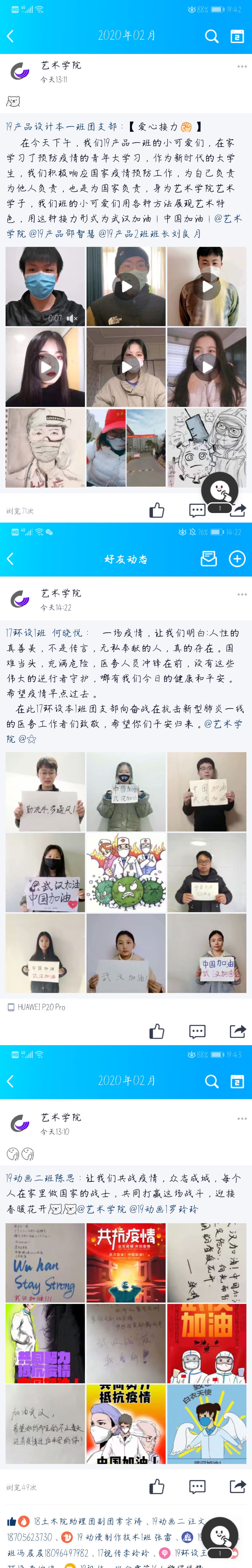 本网讯(通讯员:黄梦)自新冠肺炎疫情发生以来,习总书记做出一系列重要指示,党中央、国务院做出了重要部署,艺术学院团总支积极响应国家及学校的战“疫”号召,组织开展了“打好防疫战,贡献我力量”专题系列教育活动,近日,艺术学院团总支开展了“疫”呼百应“云团日”活动,活动的开展受到各团支部的积极响应。