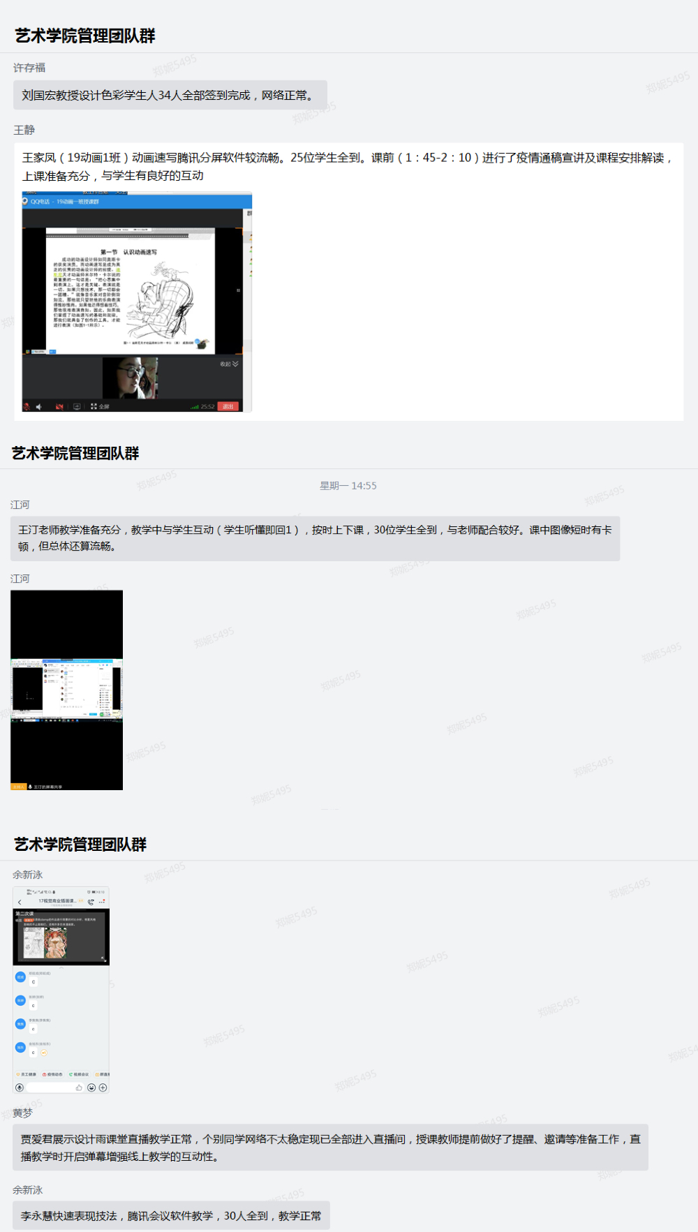 本网讯(通讯员:杨蕊)为确保线上课程教学质量,艺术学院领导班子组织召开多次专门会议,研究推出确保线上教学质量的有力举措,先后成立教学质量监控领导小组,制定线上教学质量监控方案,召开全体教师线上教学质量专题会,并组织9个教学质量检查听课组,自2月24日线上教学开课首日起,全面进行严谨到位的线上教学质量检查。