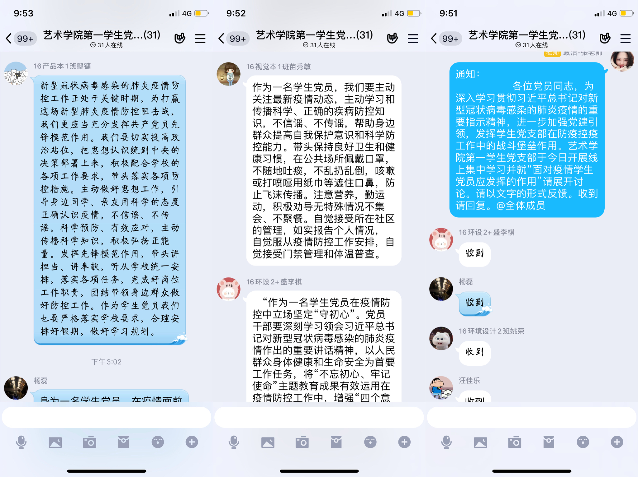 支部通过支部群线上开展集中学习,深入学习习近平总书记防控新型冠状病毒感染肺炎工作指示精神,并围绕“疫情下学生党员应如何发挥党员先锋作用”主题展开讨论。