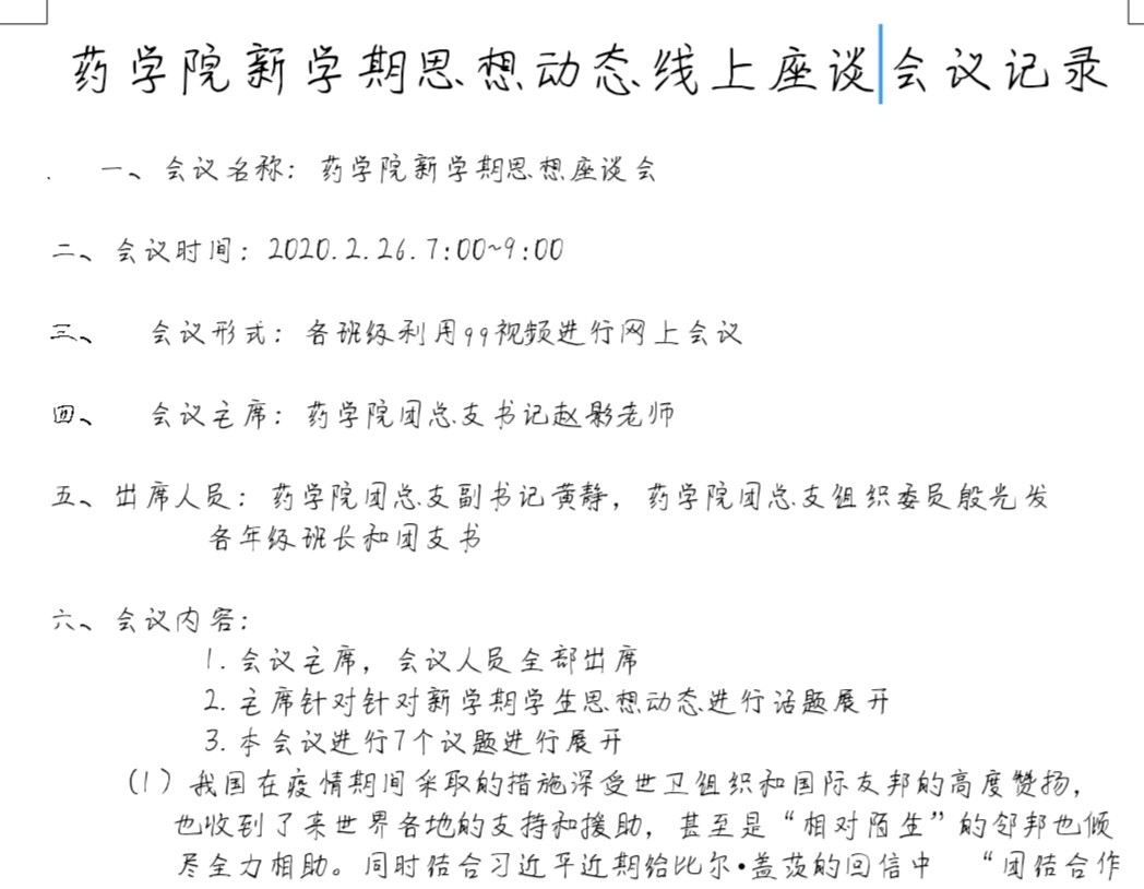 本网讯(通讯员:赵影,严兰梦)庚子年初,楚地大疫,形势严重,延迟开学。疫情期间,为了保证学生的学习和成长,我院积极开展的“停课不停学”,安排老师线上教学,线上开展丰富活动等。在线上学习期间,为及时了解疫情期间学生新学期思想动态,3月26日晚7:00,药学院召开了“2020年春季新学期学生思想动态线上座谈会”,药学院所有班级代表参加了此次会议。会议由药学院团总支书记、学管秘书赵影主讲。