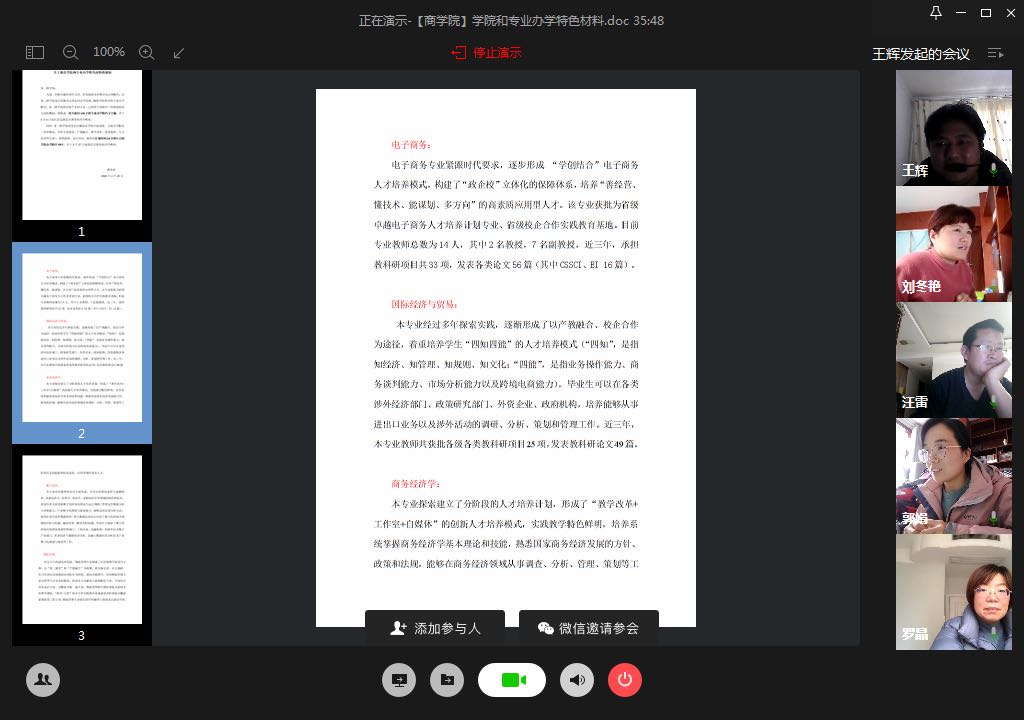会上,大家踊跃发言,从社会需求、培养模式、教育教学、教科研成果、学生就业等多方面总结和交流了各专业办学的成绩和特色。结合文件精神,大家通过线上讨论,进一步进行提炼,并逐字逐句对每一个专业文字材料进行了细致的打磨,直至完稿。
