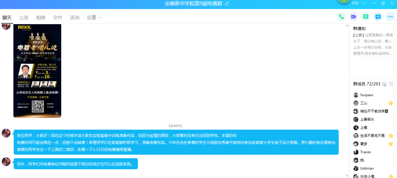 除了教师自身科研工作外,指导学科竞赛的老师们也没有放松对学生的要求,在线上认真指导参赛的学生。电子设计大赛负责人王恩亮老师和智能制造挑战赛负责人王琰琳老师在群里对学生的叮嘱及指导。