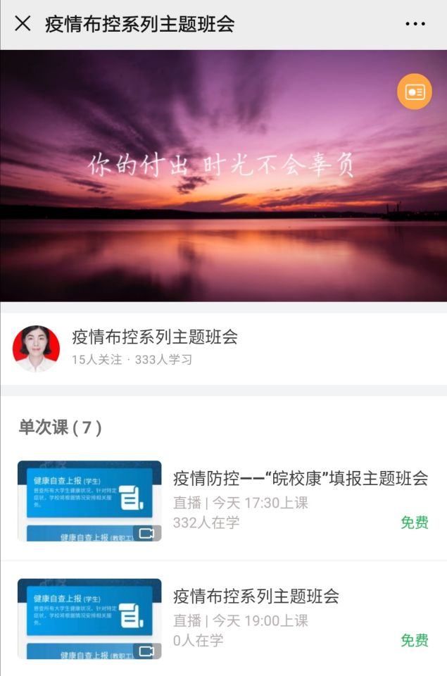 3月12日晚上的19:00-20:00,徐老师又在“微师学习”平台与大家见面了。为了更好的引导同学们在这承上启下的大三关键年,即将面临考研与就业抉择时,能够尽早明确方向、找准目标,17药学全体同学在徐导的倡导下,以“踏实静心、规划未来,把握大三、赢在校园”为班会主题,进行了一次面对面的交流与分享。