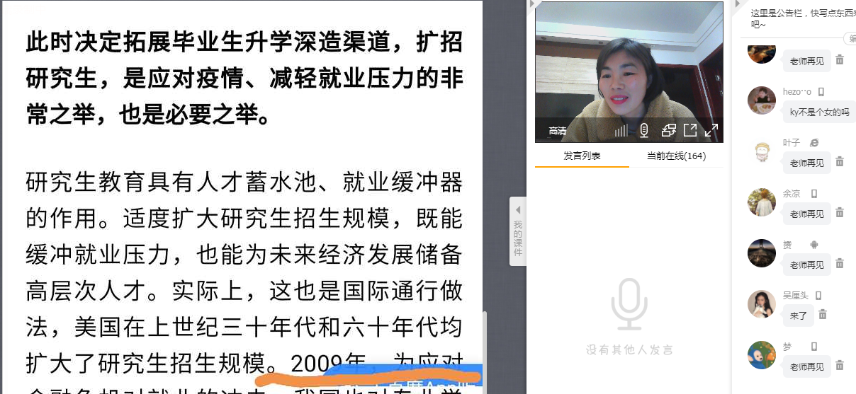 首先,徐导就近期受疫情影响,国家对研究生扩招政策向大家进行了解读,扩招能起到减轻大学生就业压力的作用,增加教育消费支出,让更多的人提升个人素质,培养更多的人才。