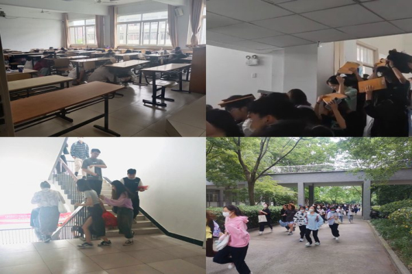 11点15分,随着警报声响起,防震应急疏散演练正式开始。老师、学生听到警报声迅速双手抱头或用书本顶在头上隐蔽课桌下方,警报停止后,学生在老师的指挥下有序从教室撤离,弓着腰,沿着指定的应急通道,迅速撤离至蜀山体育场集结,财金学院和部分大数据学院的师生参加了演练。其他二级学院派人观摩了演练活动。