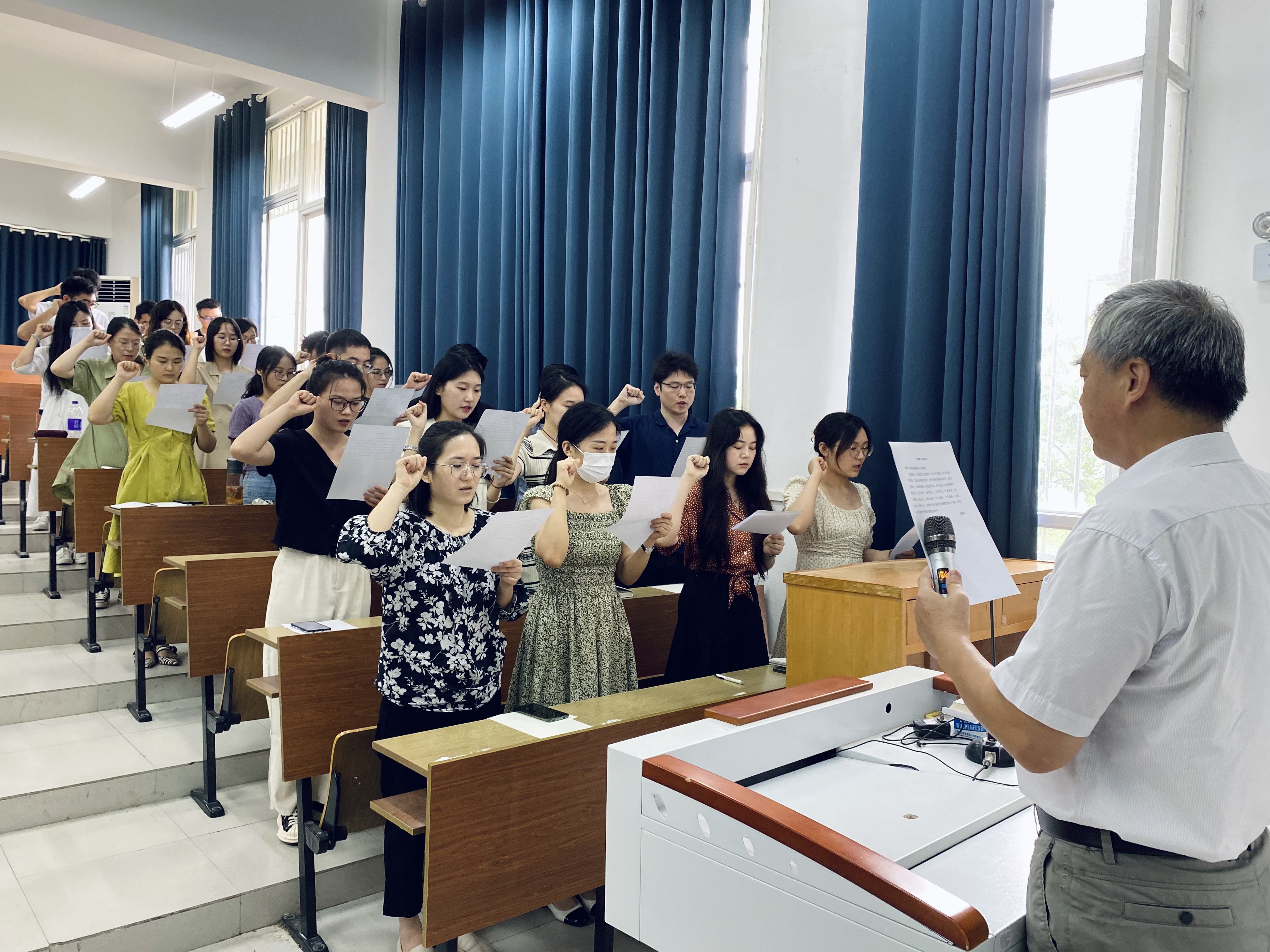 汇报结束后,特别安排了新教师入职宣誓仪式,由范东生教授领誓。通过这一特别环节,旨在增强崇高的教育使命感,坚定职业信念,确立争做“四有”好教师的发展方向。