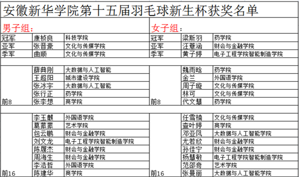 本次比赛采取回合制与淘汰制,设有预赛、小组赛、排位赛。比赛期间各选手积极表现自我,充分体现了羽毛球球不落地,人不放弃的精神,上演了杀球、拉吊、多拍僵持不下等精彩表现,更有胯下击球、背后击球等高难度动作,观赛人员也被各种高超技术动作吸引,并为之呐喊助威。最终,经过两天的精彩角逐,科技学院康桢良、药学院梁斯羽获得了冠军;文化与传媒学院张晋豪、财会与金融学院汪薏涵获得了亚军;文化与传媒学院曲顺、电子工程学院/智能制造学院黄子婷获得了季军。