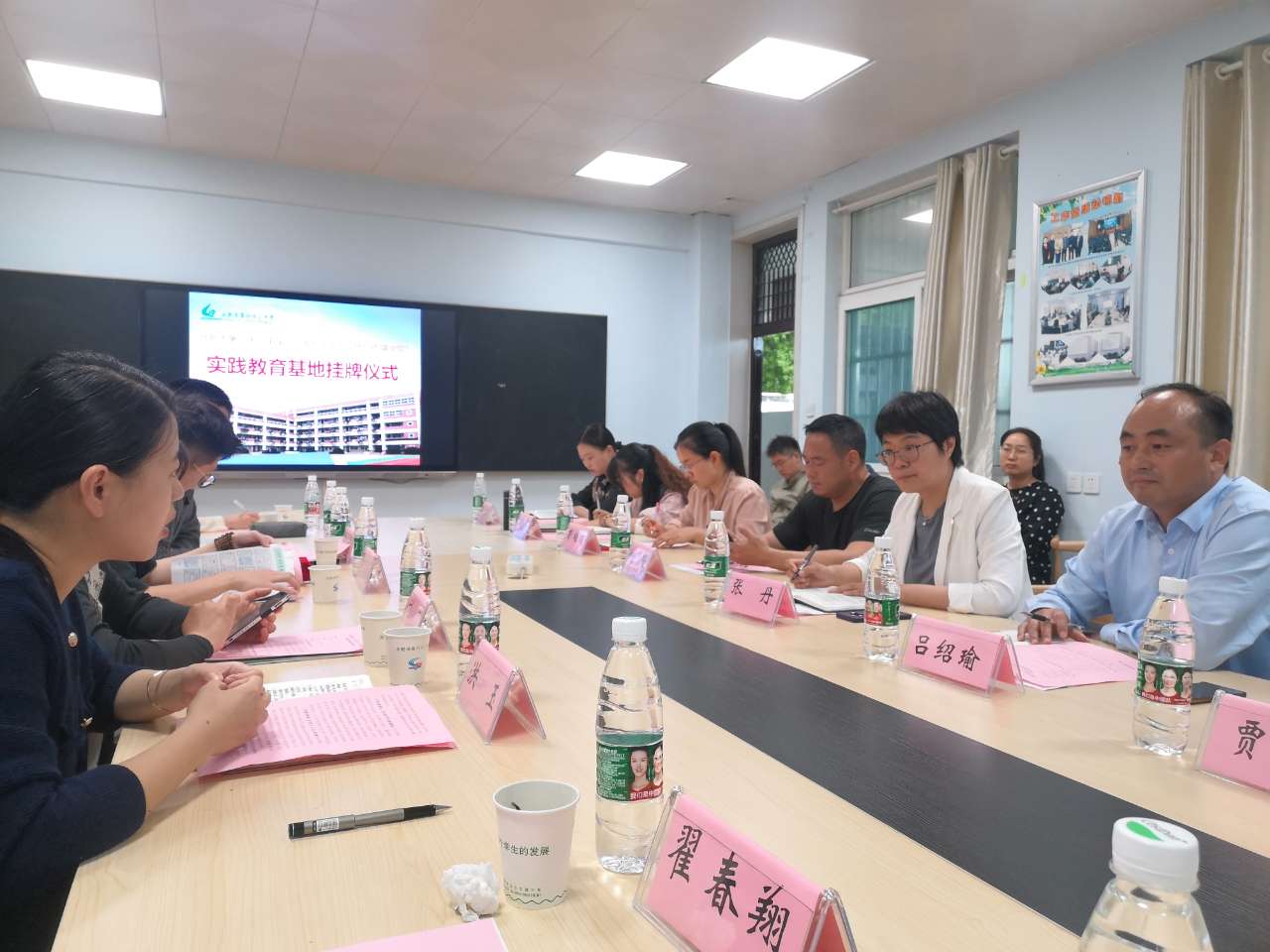 本次活动分三个环节,首先是双方介绍各自情况及特色发展。洪玉从新华学院艰苦奋斗的发展历程、文化与传媒学院的优势学科及教育系的专业特色向在座人员进行了阐述。吕绍瑜介绍了合肥市第六十二中学的红色基因、心理健康教育、羽毛球特色及小初衔接“四张名片”的发展历程。同时,双方就实践教育的“导师制”模式进行了交流,双方表示将以立德树人为宗旨,探索人才培养的新模式,挖掘双方合作的新资源,共谋双方发展的新格局。最后,双方就实践教育基地进行揭牌,力求将实践教育工作落到实处,推进两校后期在学生实习、活动开展及教研活动的合作交流。