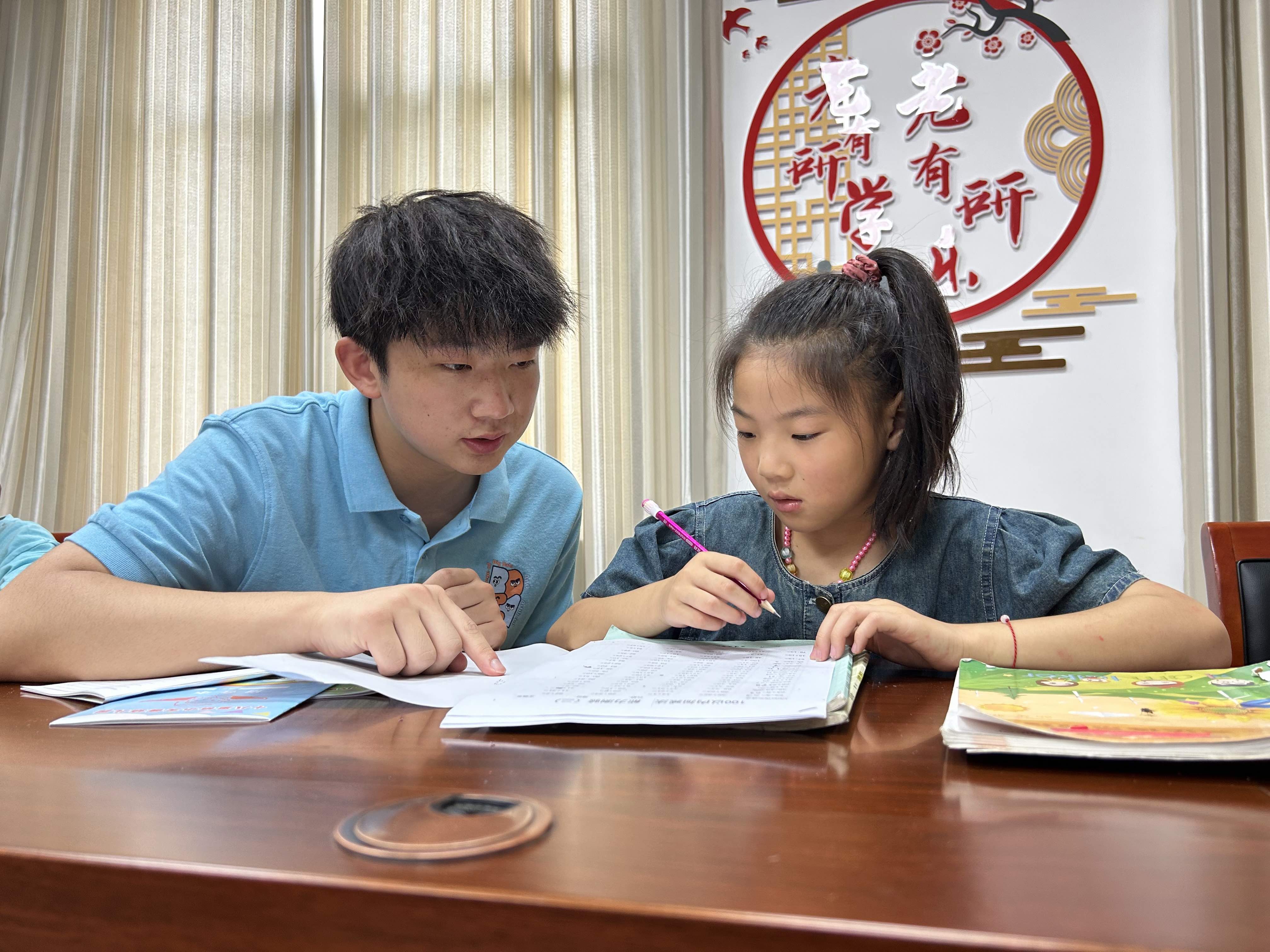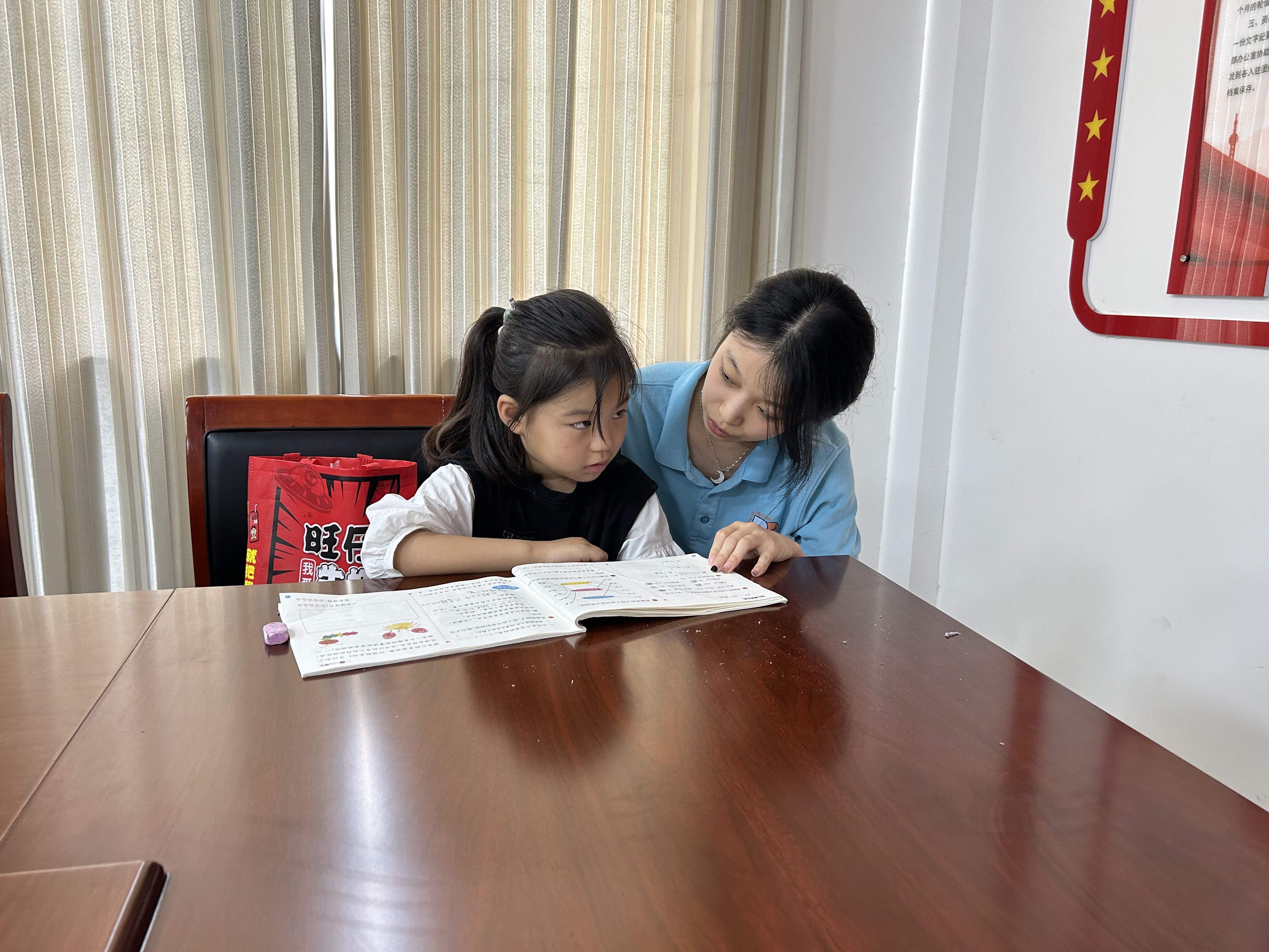 在小怀村青年之家,看到孩子们纯真无邪的眼神,服务团成员们深感责任重大,大家用生动有趣的故事,引导留守儿童们认识到学习的重要性,激发他们的学习兴趣。同时,也鼓励他们积极大胆发言,分享自己的学习方法和心得。在辅导的过程中,服务团成员认真检查留守儿童的暑假作业,并针对他们在写作业时所遇到的错题、难题,耐心细致地讲解解题思路,鼓励留守儿童通过对解题方法的掌握,发散思维,努力做到自己攻克难题。来自十七中的姬梦琪小朋友在学习过程中尤为认真,她说,“我开学上三年级,要开始学英语,哥哥姐姐帮我学习英文字母,教我读音标,还有姐姐教了我混合运算,我就错了两题,姐姐还教了我两位数乘一位数,我也学会了。”