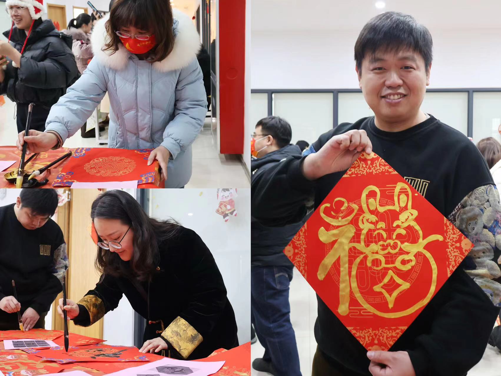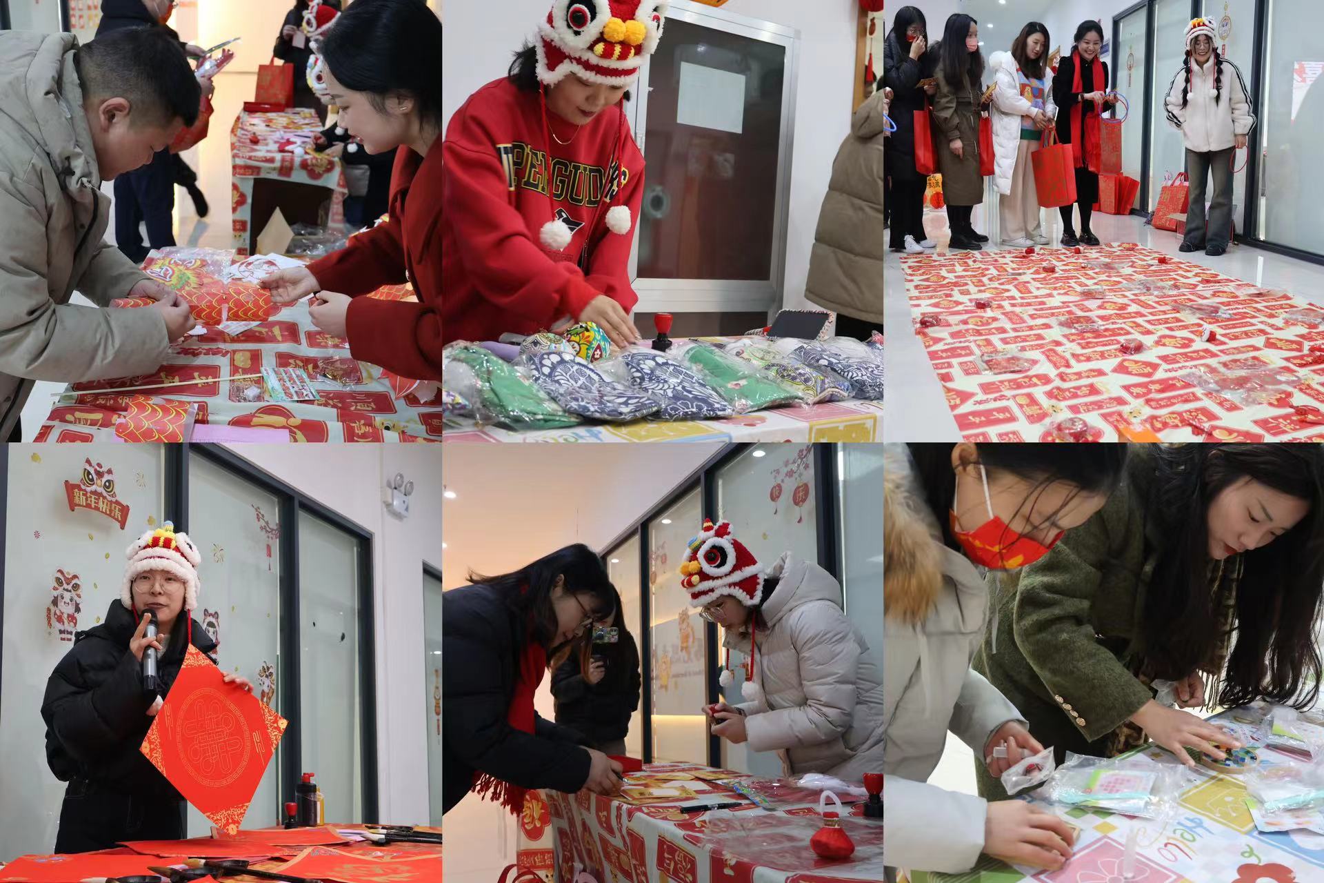 随后,活动进入到精彩纷呈的新春集会环节。集市里设置了各种手工制作“小摊位”,每位“摊主”也设计了不同的互动环节,有邀请老师们写福字的“幸‘福’来报到”、制作艾草锤的“烦恼‘捶捶’消”,还有套圈游戏“快乐甜甜‘圈’”等不同主题的手工活动。套圈游戏中,大家手持竹圈,瞄准目标,奋力投掷,不仅考验着教师的眼力和技巧,更增进了彼此间的竞争与合作,教师们在欢声笑语中互相切磋、共同进步;写福字的摊位上,教师们挥毫泼墨,书写着一个个饱满有力的“福”字,感受传统文化的魅力,传递对新年的美好祝福;教师们还一起制作了艾草锤、龙帽、杯垫等传统手工艺品,大家围绕在一起,一边交流着制作技巧,一边相互帮助完成作品。老师们也各显才能,展现才艺,用歌唱、舞蹈等丰富多彩的形式尽情绽放风采,集会在一片温馨和谐的气氛中落下帷幕。