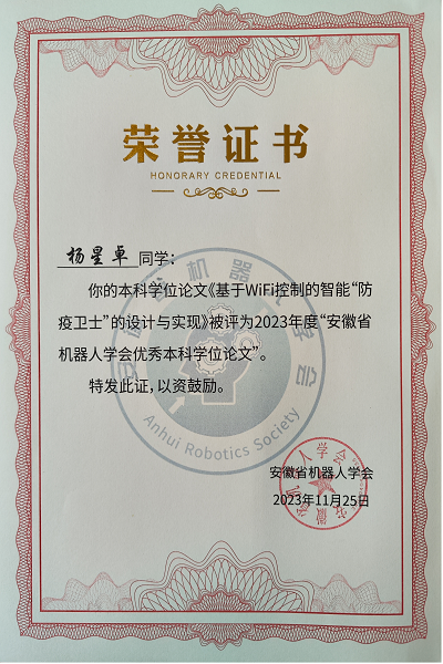 贝博官网学子毕业论文获评2023年安徽省机器人学会优秀本科毕业论文