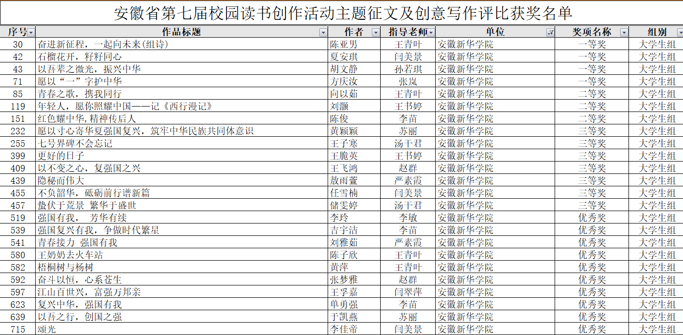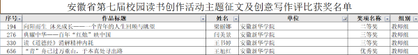 本网讯(通讯员:严素霞)近日,由省委教育工委、省教育厅、省人力资源和社会保障厅、省文化和旅游厅、省新闻出版局、团省委共同主办的安徽省第七届校园读书创作活动落下帷幕,贝博官网师生在本次活动中喜获佳绩,获得各类奖项共32项,其中一等奖4项、二等奖5项,三等奖10项,优秀奖13项。获奖名单如下: