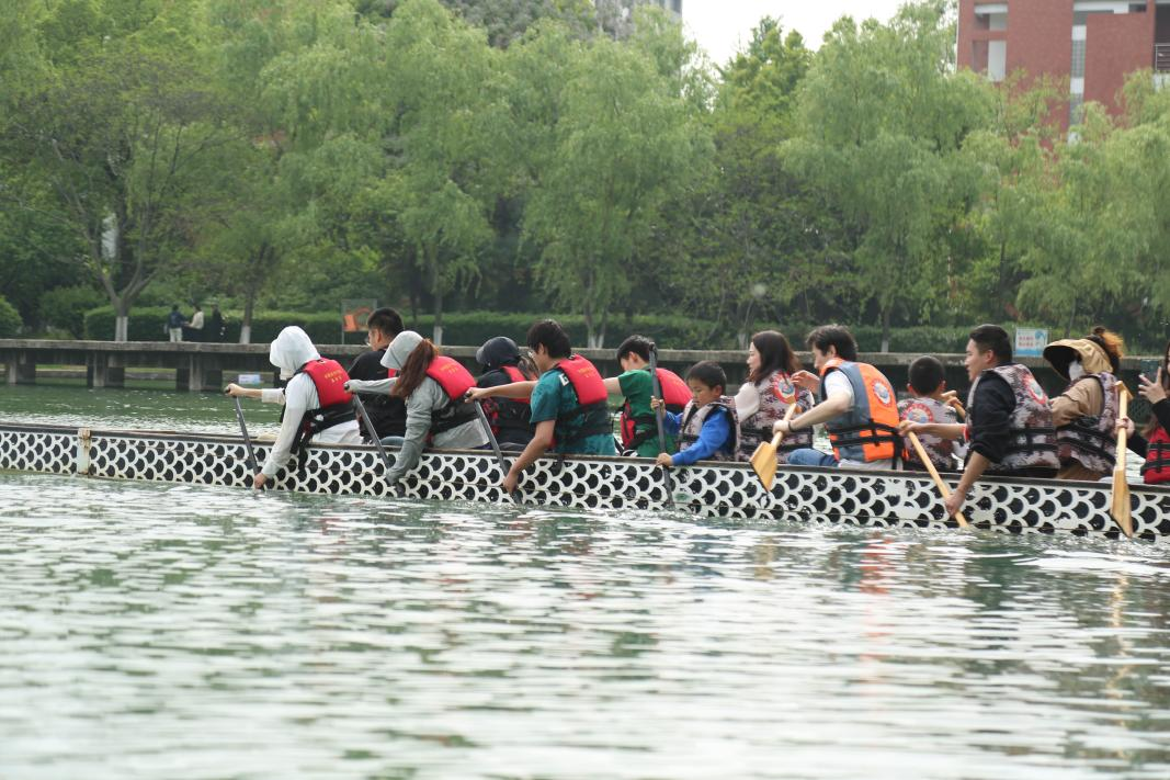 游戏结束后,校友们分成两队分别在校友办老师的带领下,漫步于绿意盎然的校园,重温青春岁月;另一队则来到如琴湖畔,在龙舟队老师的指挥下,酣畅淋漓地体验了一把“龙舟竞渡”的乐趣。