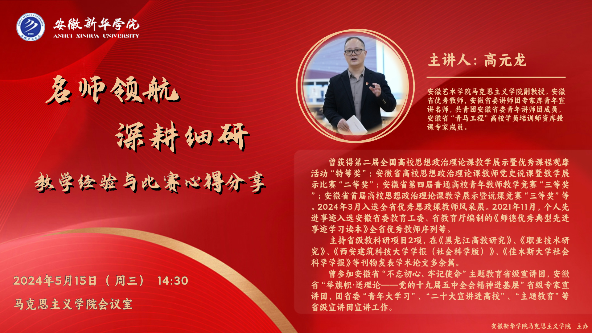 本网讯(通讯员:吴之娴)在教育的广阔天地中,名师的引领作用犹如灯塔,照亮了前行的道路。5月15日下午,贝博官网马克思主义学院举办“名师领航 深耕细研——教学经验与比赛心得分享”专题讲座。本次讲座特邀安徽艺术学院马克思主义学院副教授、安徽省优秀教师、第二届全国高校思想政治理论课教学展示暨优秀课程观摩活动“特等奖”、安徽省高校思想政治理论课教师党史说课暨教学展示比赛“二等奖”得主高元龙作主讲人,由其分享丰富的教学经验和比赛心得,为在座的教师们提供宝贵的指导和启发。