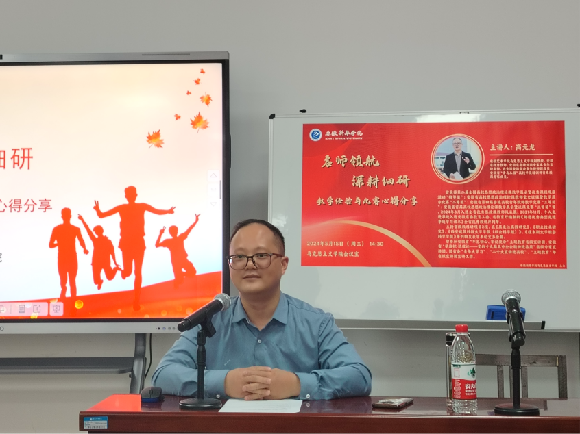 在比赛心得分享环节,高元龙详细介绍了自己参加全国高校思想政治理论课教学展示暨优秀课程观摩活动的历程,分享了备赛的经验和比赛中的策略。他鼓励在座的教师们要勇于挑战自我,不断提升教学水平,以更好地适应新时代的教育需求。