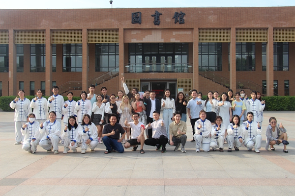 阳光明媚,夏日傍晚,中外学子们在图书馆南广场青青草地上,沉浸式练习五禽戏,全身心地体验感受中国健康养生文化,其乐融融。