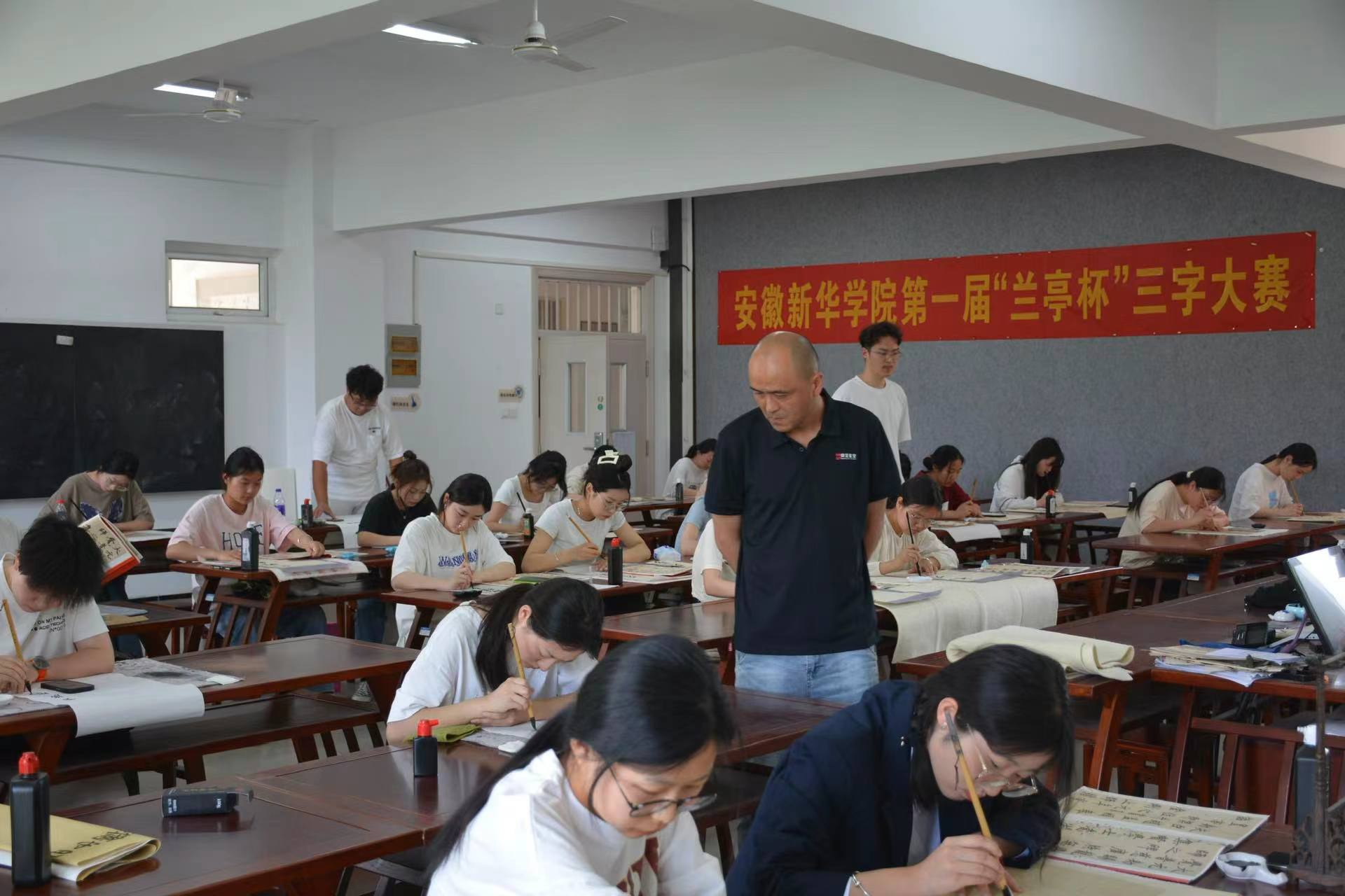 大赛分毛笔、硬笔、粉笔、篆刻四条赛道,共吸引学校近400多名同学参加,通过初赛遴选,最后68名学生进入决赛。担任本届大赛评委的有长丰县十井小学校长吴硕勇,安徽传伟文化艺术传播有限公司书法教学朱皓副校长,BB贝博艾弗森官方网站艺术学院江建龙教授,BB贝博艾弗森官方网站文化与传媒学院书法教师贺书颜、刘岳恒。