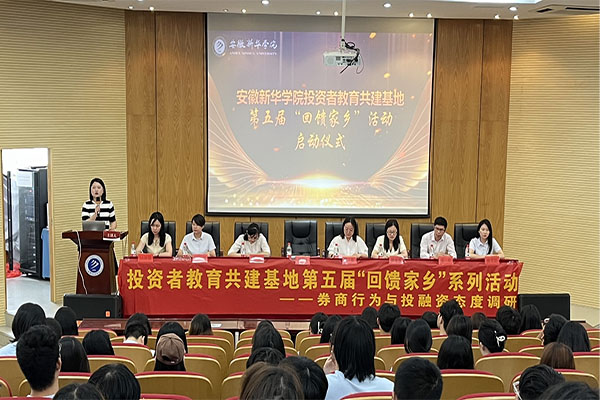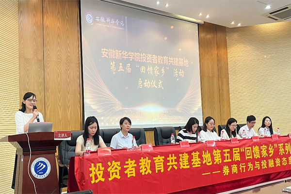 本网讯(通讯员:屈文静)6月24日上午,财会与金融学院在学术报告厅成功举办了第五届“回馈家乡”系列活动启动仪式。执行院长濮明月,副院长彭智,院长助理邓洁、解寒静,指导教师代表以及全体2023级经济与金融、金融科技专业的学生参与到本次活动之中。活动还邀请了国元证券天达路营业部负责人汪凤霞、合规专员张文娟,以及华龙证券理财经理杨欢、纪羽晨作为企方代表出席本次活动。活动由金融系主任助理潘霞主持。