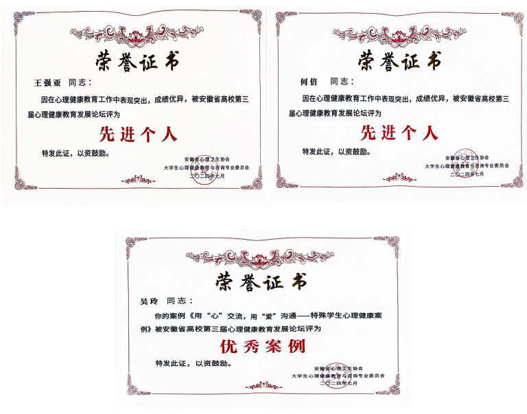 本网讯(通讯员:吴玲)7月5日至6日,长三角高校心理健康学术交流会暨安徽省高校第三届心理健康教育发展论坛在池州顺利召开。学校5名学工人员参加了此次会议。本次会议由池州学院、安徽省心理卫生协会大学生心理健康教育与咨询专委会和安徽省学生心理健康教育指导和发展中心主办。贝博官网学生处副处长王强亚获评“学工系统先进个人”,大学生心理健康教育中心何倍获评“专兼职咨询师先进个人”,吴玲提交的《用心交流,用爱沟通——特殊学生心理健康案例》个案被评为“优秀案例”。