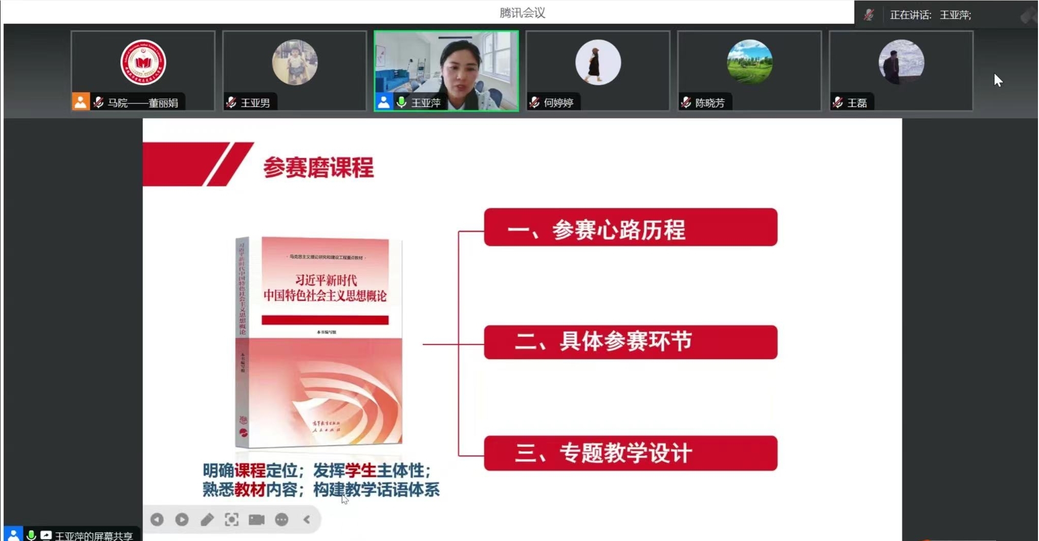 接着,王亚萍老师以“话剧演员”的表演张力为喻,分享自己对好课多磨之“磨教师”的认识。她强调,教师对教材内容的熟悉度是授课和参赛的基本功,随时随地积累备课素材是上好思政课的重要条件,勤做教学反思是思政教师自我提升的关键。