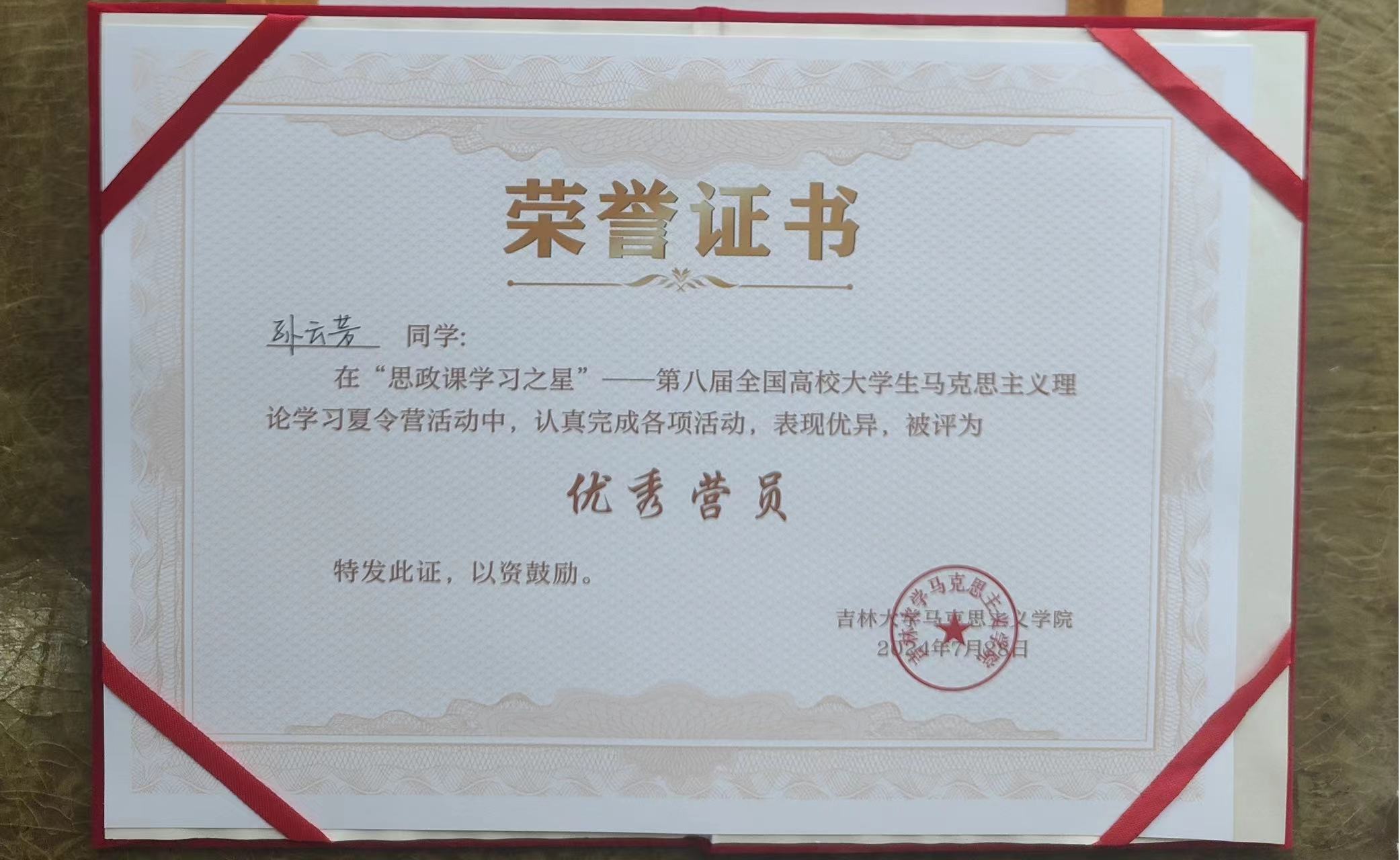 本网讯(通讯员:孙云芳)为深入学习贯彻落实习近平总书记关于学校思政课建设的重要指示,全面落实新时代学校思政课推进会精神,守正创新推动思政课建设内涵式发展,不断提高思政课的针对性和吸引力,第八届全国高校大学生马克思主义理论学习夏令营活动于7月21日至28日在吉林省长春市成功举办。本次活动由教育部高校思政课教学指导委员会主办,吉林大学承办,“青梨派”、全国“大思政课”实践教学数字地图协办。经安徽省教育厅遴选推荐,贝博官网小学教育1班孙云芳同学获参营资格并荣获“优秀营员”称号。