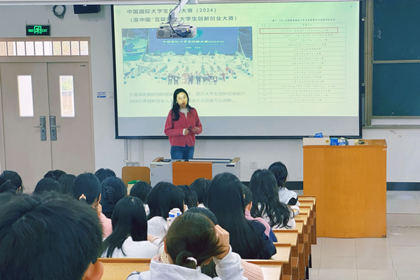 项燕以“中国国际大学生创新大赛讲解”为题,从“什么是创新大赛”“为什么要参加创新大赛”“如何参加创新大赛”“创新大赛赛道设置和评审标准”“如何完成高质量的项目计划书”五个维度为学生做了详细讲授。项燕又从备赛角度出发,给出“全、细、简、准、信、真、信”七字要诀,勉励在场学生要敢闯会创、爱拼才赢;张梦雅则以现场项目路演的形式开展分享,讲解了如何将专业知识应用于解决实际社会需要,并鼓动新生们要积极向有相关经验成果的学长学姐请教知识,汲取本领,实现大创项目团队的传承与超越;陈启虞则围绕“从优秀创意到项目落地”的主题进行分享,他提出“创意落地=创意+组织与执行+团队力量+参赛技巧”,强调了创新意识和创业组织能力同等重要,从项目申请到打磨落地,需要持续地进行方向调整和自我学习。最后,陈启虞组织现场师生进行了互动答疑。