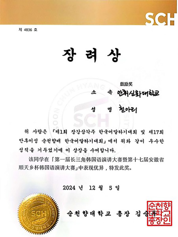 本网讯(通讯员:王佳欣)为给贝博官网学子提供开拓文化视野与展示语言能力的宝贵机会,12月5日,2023级计算机科学与技术(对口)2班的陈雅丽同学与外国语学院王佳欣老师一同赴合肥大学,参加了“第一届长三角韩国语演讲大赛暨第十七届安徽省顺天乡杯韩国语演讲大赛”决赛,并荣获鼓励奖。