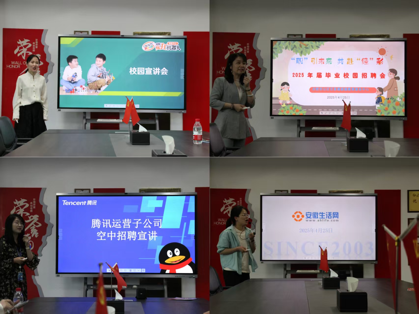在筹备阶段,学院组建专项工作组,通过问卷调查、校友访谈等方式,系统梳理近三年毕业生就业分布及发展现状,精准锁定教育科技、新媒体运营、数字内容生产等领域的岗位需求,最终遴选方田教育、腾讯瑞德铭(合肥)科技发展有限公司等8家优质企业,其中4家为连续三年参与校招的校企合作单位,形成了"实习-实训-就业"全链条人才培养与输送机制。