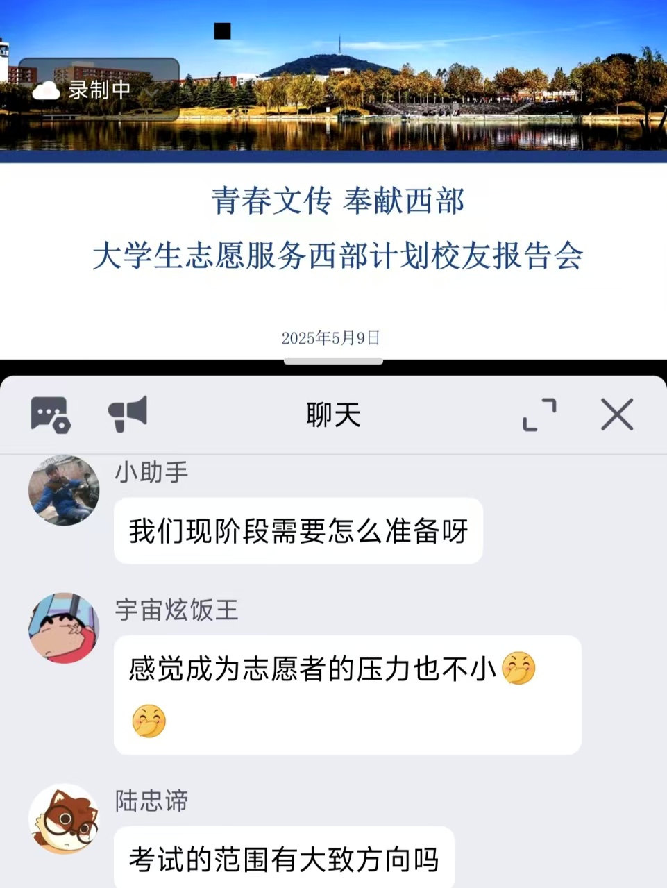 本网讯(通讯员:阳俊琍、张婉琦) 为深入贯彻落实国家关于引导高校毕业生服务基层的就业政策,进一步强化文化与传媒学院对西部计划专项的推进力度,5月9日下午,学院通过线上形式举办“青春文传 奉献西部”大学生志愿服务西部计划报告会。会议特邀2023届校友吴伟(现任职西部某地党建办)、2024届校友褚志成(现任职塔城地委组织部)担任主讲,旨在通过校友经验分享与政策解读,为2025届、2026届毕业生提供西部就业指导与精神激励。行政秘书阳俊琍主持会议,150余名有西部服务意向的学生参与。