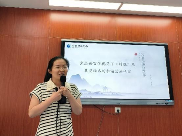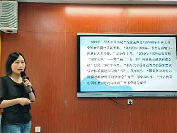 会议伊始,陈钢玲介绍了本次会议的内容和意义。随后,在热烈的掌声中,周丹丹、徐瑞华两位优秀教师依次登台分享。周丹丹老师以《生态语言学视角下 <诗经> 及其英译本的和谐话语研究》为题,向在场教师娓娓道科研心路历程,周丹丹老师强调,项目的打磨需要反复审视研究价值与创新点,为此她多次推翻原有思路,重新梳理文献脉络,确保研究兼具理论深度与现实意义。徐瑞华老师围绕《大学英语课程思政中的国家意识》展开分享。她结合当下外语教学改革趋势,点明在 “立德树人” 根本任务的指引下,大学英语课程思政建设已成为新时代外语教育的重要方向。