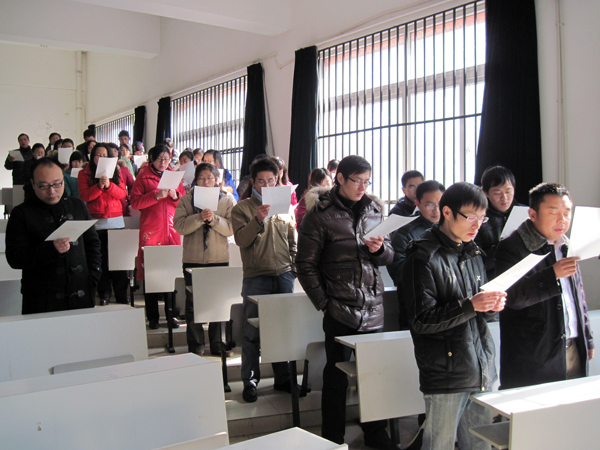 伴随着冬日里温暖的阳光,元月6号中午,原工学院的全体老师在C阶202排练年终晚会大合唱曲目“明天会更好”。