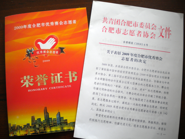 信息工程学院马乐同学荣获“2009年度合肥市优秀赛会志愿者”荣誉称号