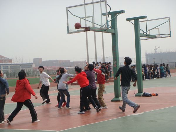 在比赛开始前,外国语学院对比赛进行了精心的筹划准备。开幕式过后,比赛正式开始。今天进行的是第一场比赛,参赛选手分别来自英语09级本科一班和09级商务英语三班。比赛打得虽然没有专业篮球赛那么激烈,但是“3+2”这种特殊的组合,赋予了比赛很强的观赏性。男生处处为女生创造进球机会,女生也频频得分,引来观众欢呼叫好。