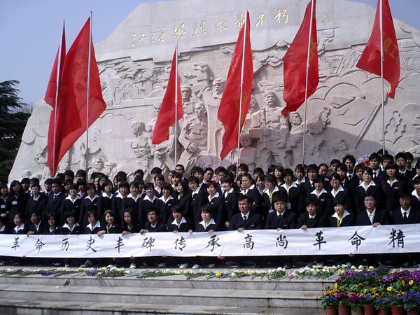 早晨8时许,所有同学准时在工大食堂广场集合。同学们排着整齐的队伍,很快就步行来到了蜀山烈士陵园。同学们向革命先烈敬献黄菊花,表达对他们的哀思与怀念。面对着江淮烈士纪念碑,大家集体宣誓:“准备着,时刻准备着,为共产主义事业而奋斗。”