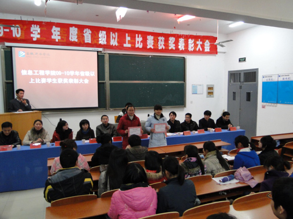 3月24日下午,信息工程学院组织召开了“2009—2010年度学生参加全省各级各类比赛获奖表彰大会”。出席本次表彰大会的老师有信息工程学院行政负责人、院长助理以及获奖学生的指导老师和辅导员。