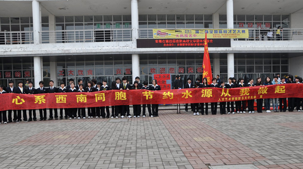 3月31日,在学院工大广场人文艺术学院团总支学生会举行了“情系西南同胞,节约用水,从我做起”万人签名活动。